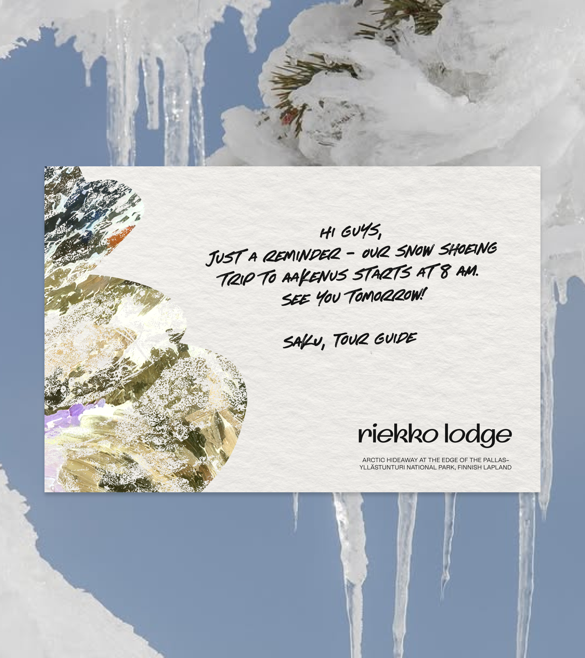 The visual identity is designed to feel personal and lived-in, as if the materials were created by the guest themselves: notes written during the trip, a postcard sent home, or small observations collected along the way. Rounded, friendly letterforms and the playful Riekko symbol create an approachable tone, while abstract textures inspired by fell landscapes, lichen, moss, and ice add a tactile, imperfect quality.