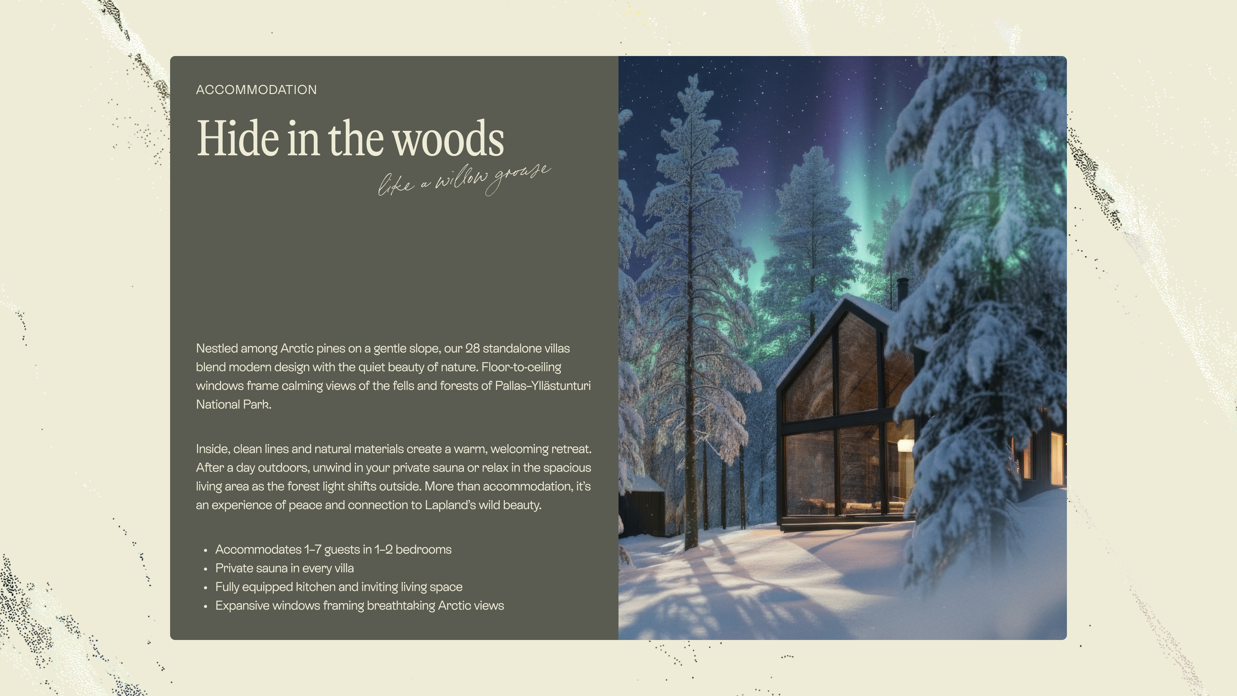 An Arctic hideaway for adventuring, relaxing, sleeping and eating, right at the edge of the Pallas-Yllästunturi National Park.