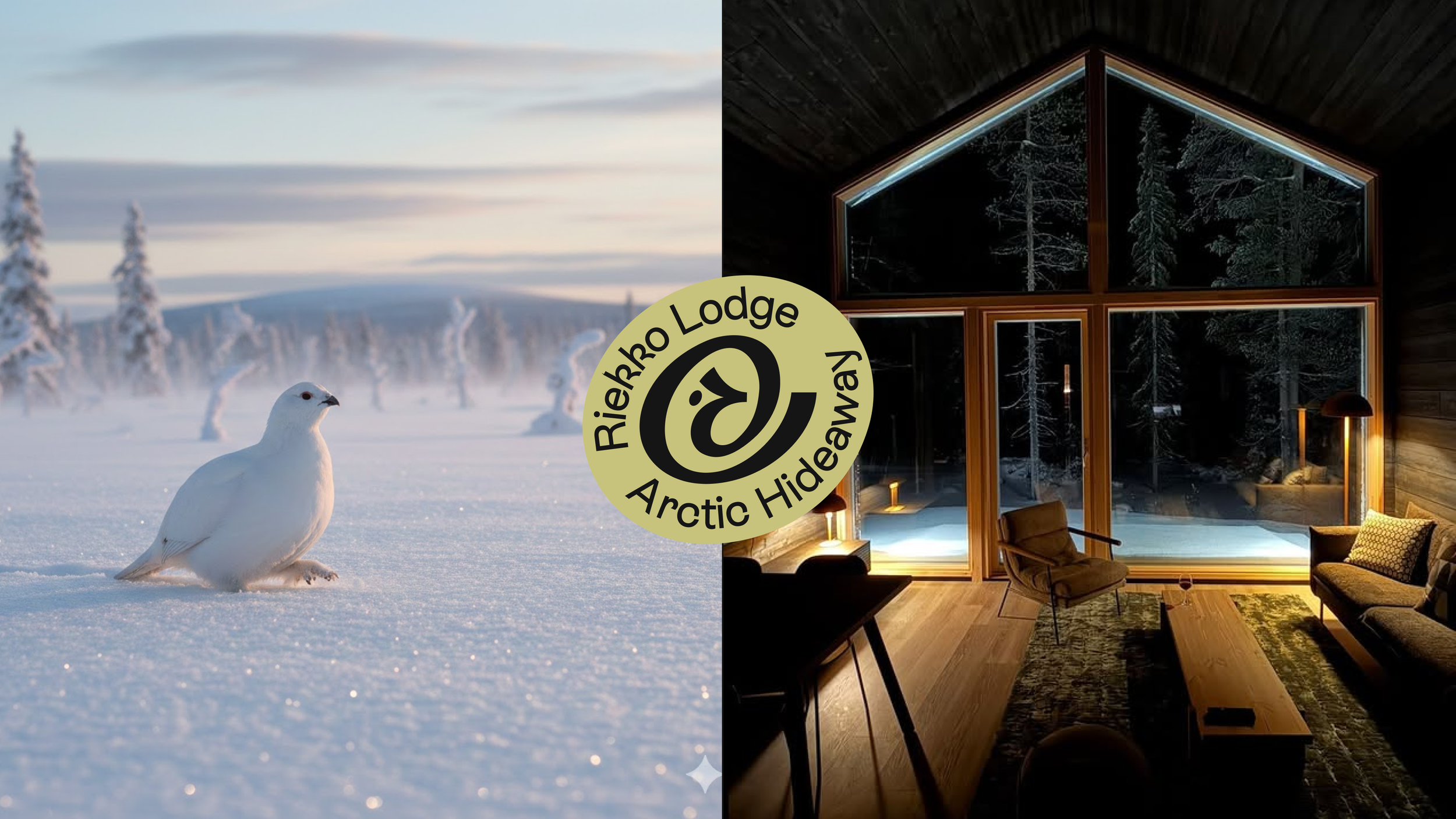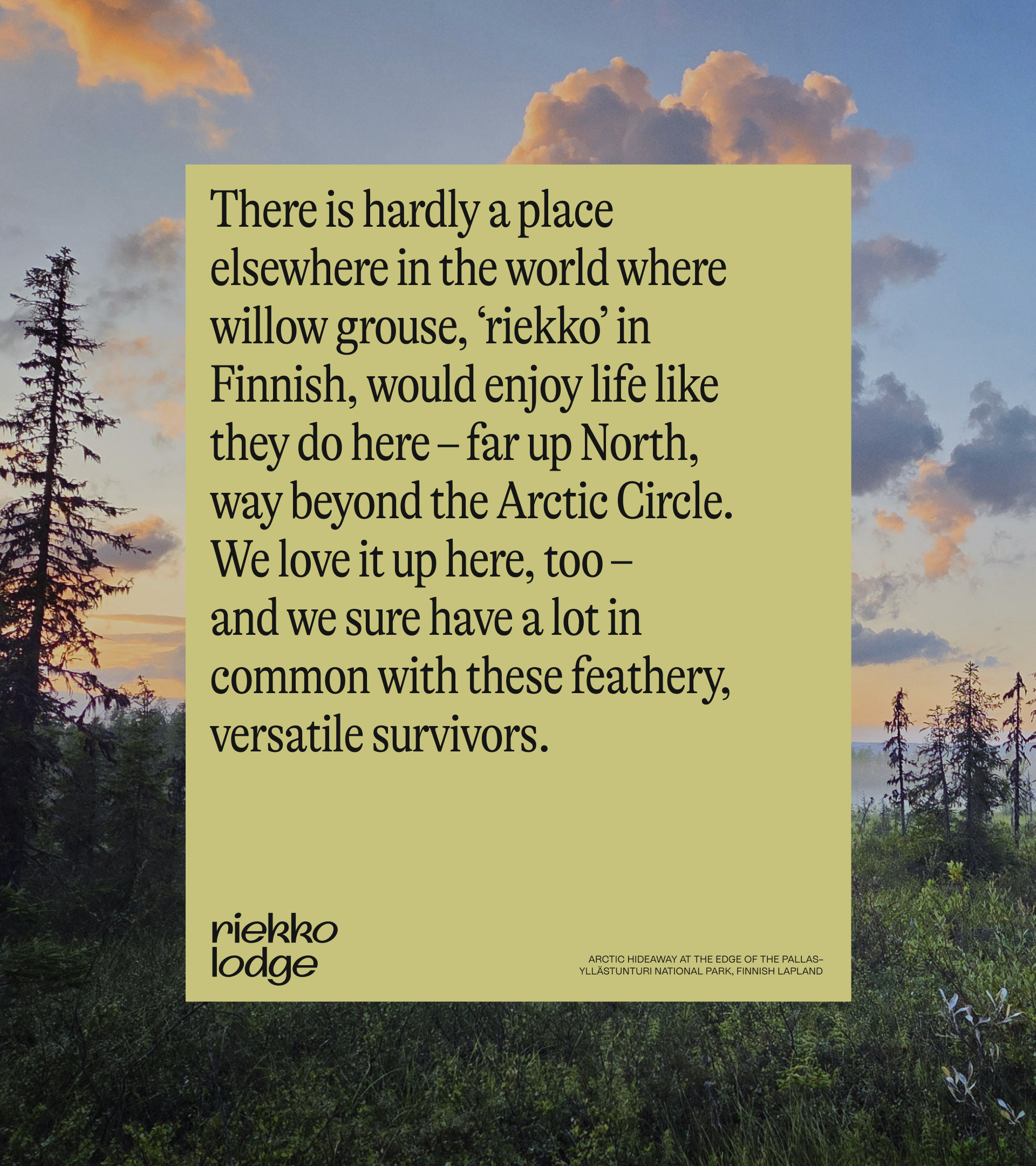 Far up north, beyond the Arctic Circle, the willow grouse (riekko in Finnish) thrives in a landscape shaped by constant change. Adaptable, observant, and deeply attuned to its surroundings, the bird became a natural conceptual reference. We saw a clear parallel between the willow grouse and the visitor: moving between nature and shelter, activity and rest, collecting fleeting moments along the way. This shared way of experiencing the place formed the foundation of the visual identity.