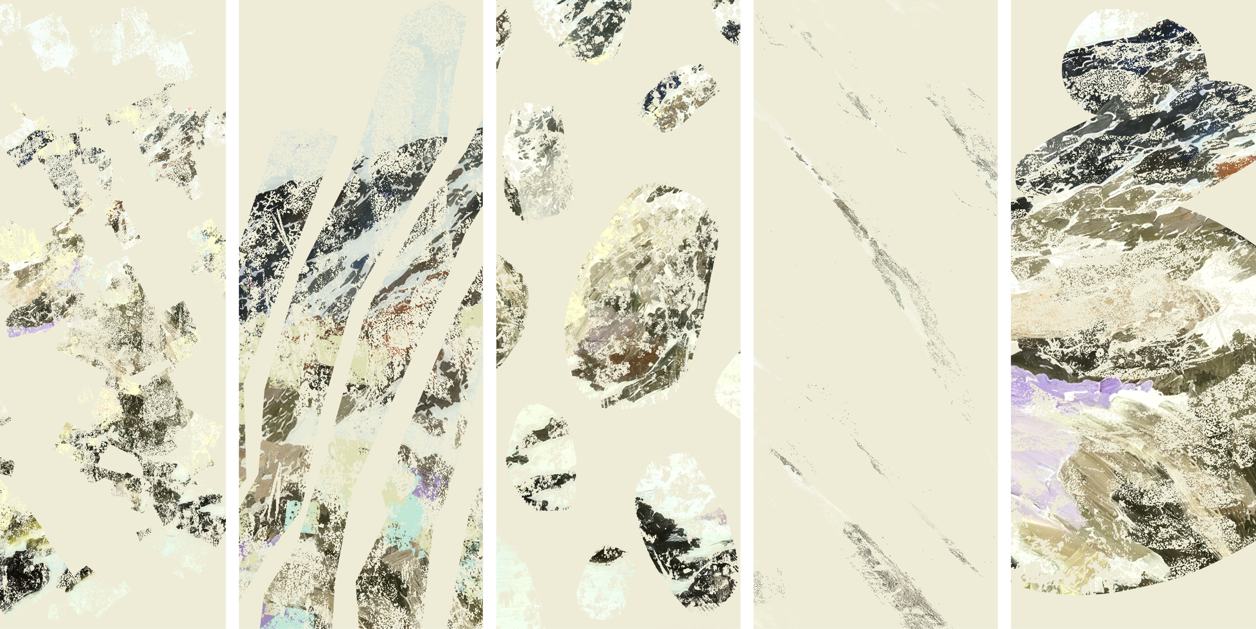 Rather than depicting nature literally, the identity gathers multiple impressions into abstract compositions. Within the textures, one can sense frost-sculpted snow, scattered animal tracks, the soft sweep of a grouse’s wings, wind-polished stone, and patches of summer lichen clinging to rock. The forms overlap, fade, and reappear mirroring how traces in nature reveal themselves gradually, appearing and disappearing over time.